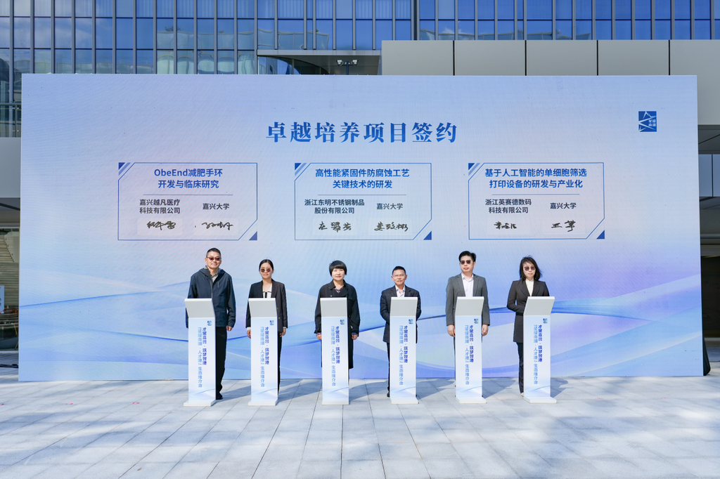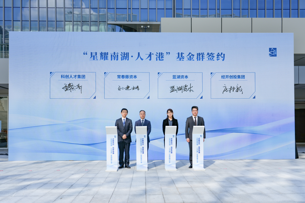 创新离不开资金支持,为支持“人才港”企业发展,嘉兴科创人才集团、经开创投集团联合设立星耀南湖人才港基金群。常春藤投资合伙人孙建锵、蓝湖资本投资者关系总监寇珍珠、嘉兴科创人才集团总经理孟繁奇、嘉兴经开区创投集团董事长庄林毅共同签订科创基金合作协议。孟繁奇、庄林毅还与10个“星耀南湖·人才港”基金投资项目签约。