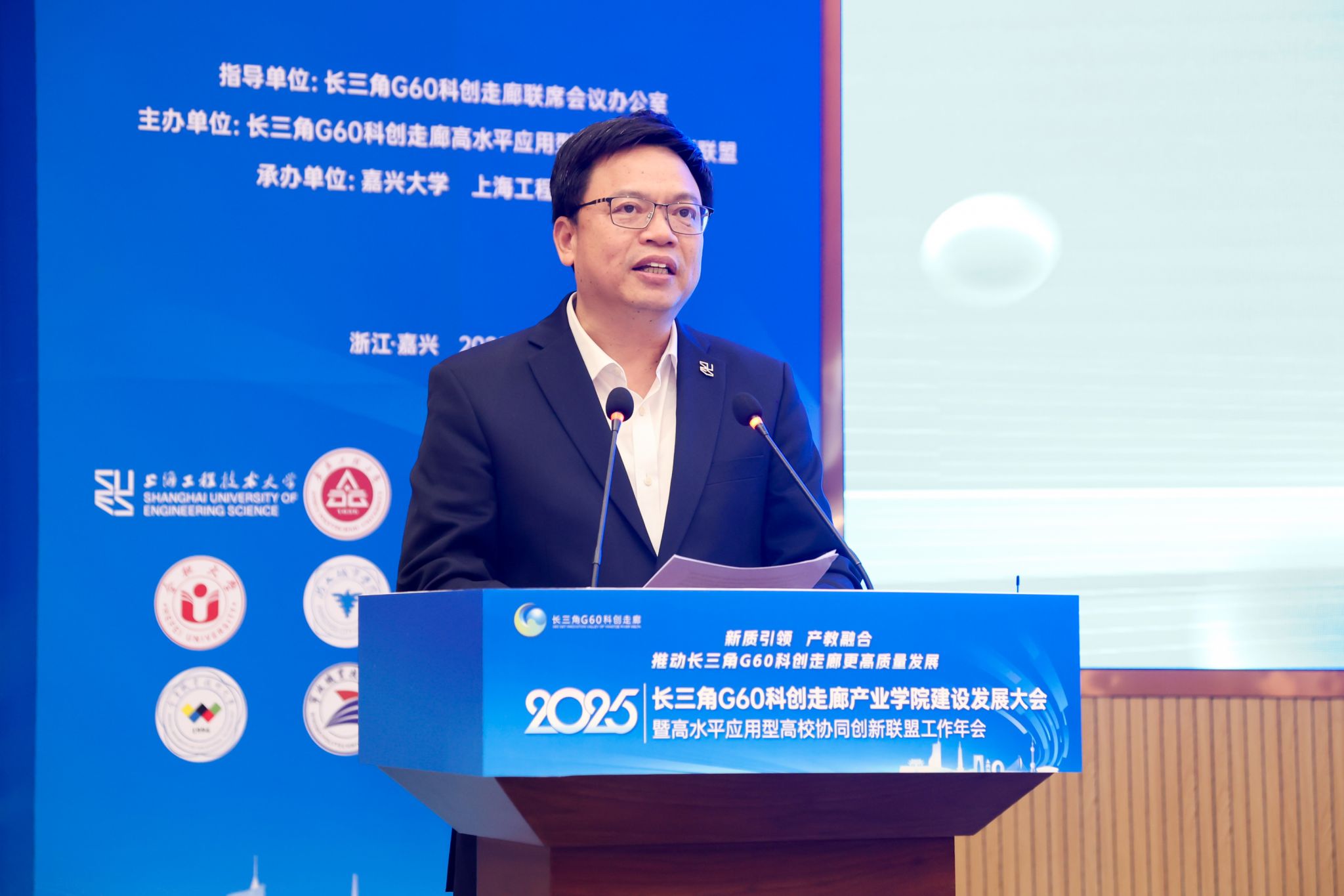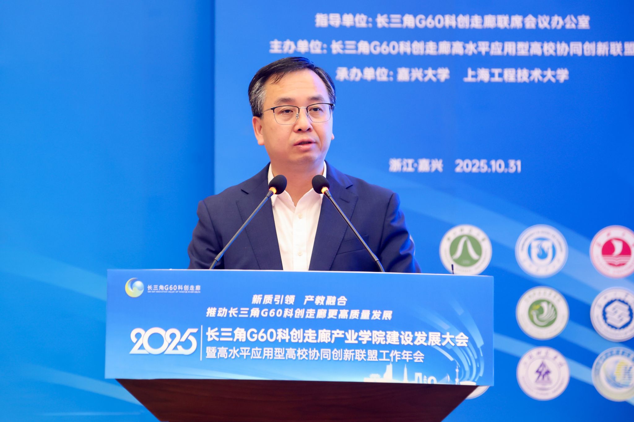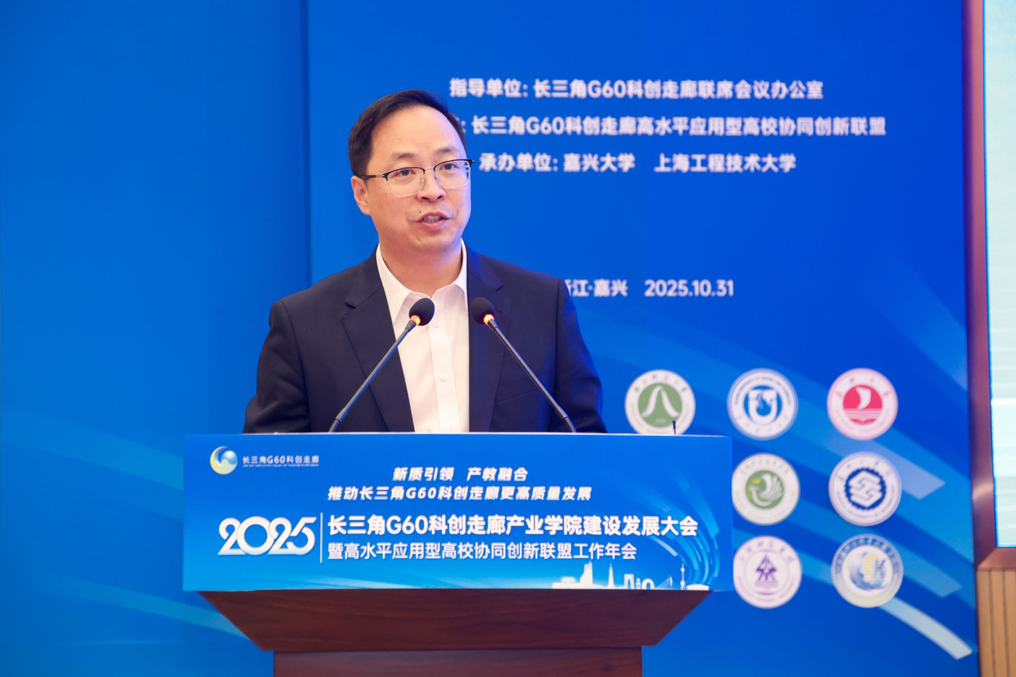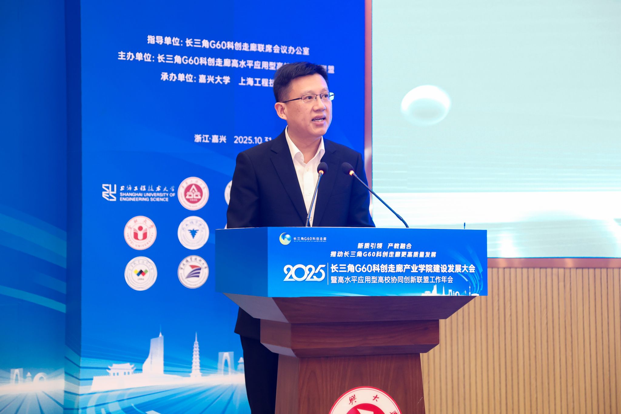 10月31日下午,以“新质引领、产教融合,推动长三角G60科创走廊更高质量发展”为主题的2025年长三角G60科创走廊产业学院建设与发展大会暨高水平应用型高校协同创新联盟年会在嘉兴大学举行。G60联席办主任、松江区委常委、副区长刘福升,嘉兴市政府副秘书长金球,嘉兴大学校长梅德庆,合肥大学校长任永,上海工程技术大学副校长夏春明,宁波职业技术大学校长吴向鹏,宣城职业技术学院副院长蔡冠群,上海科创职业技术学院副校长汪崇德出席。嘉兴大学党委委员、副校长王立玮主持年会。