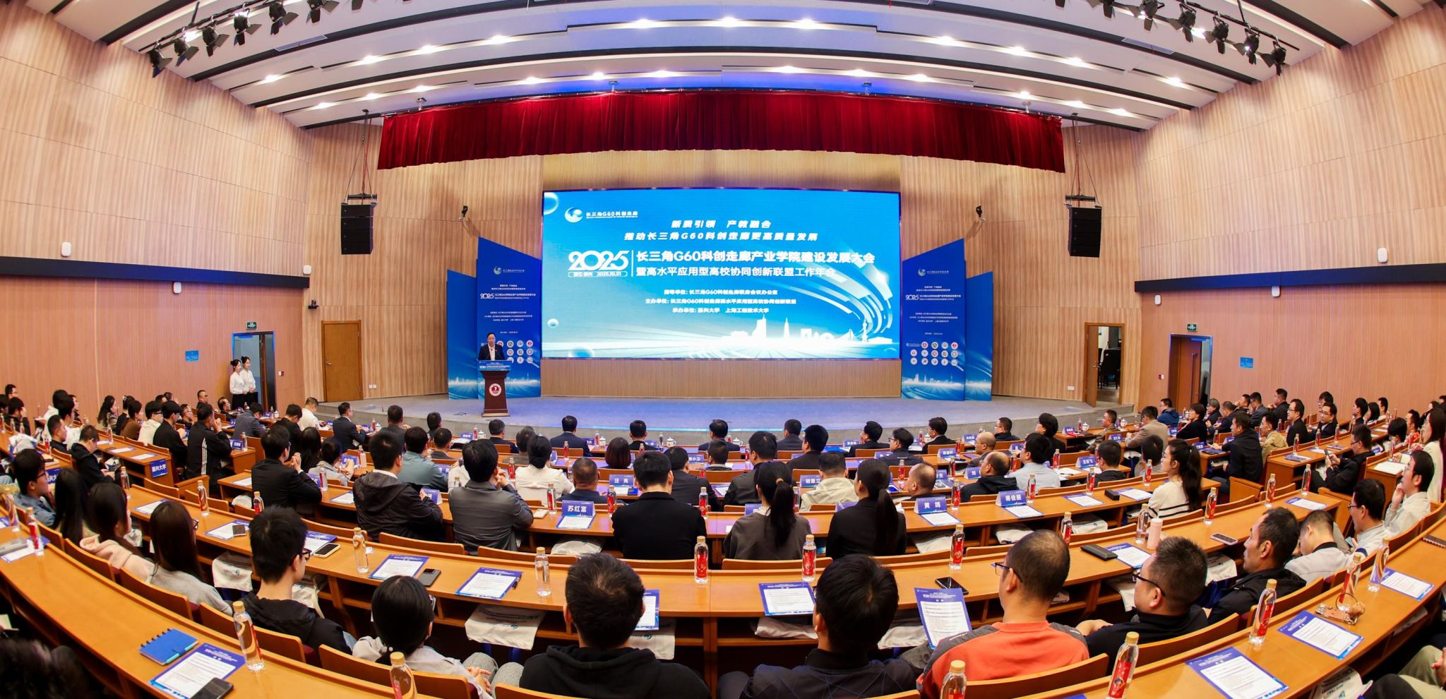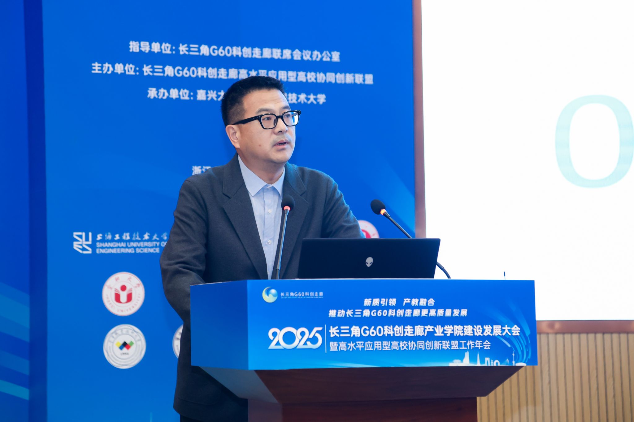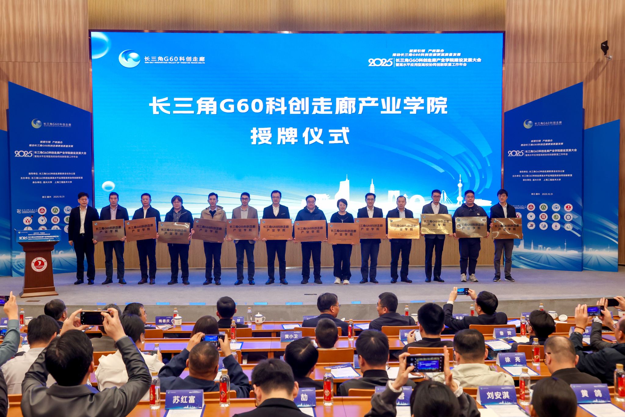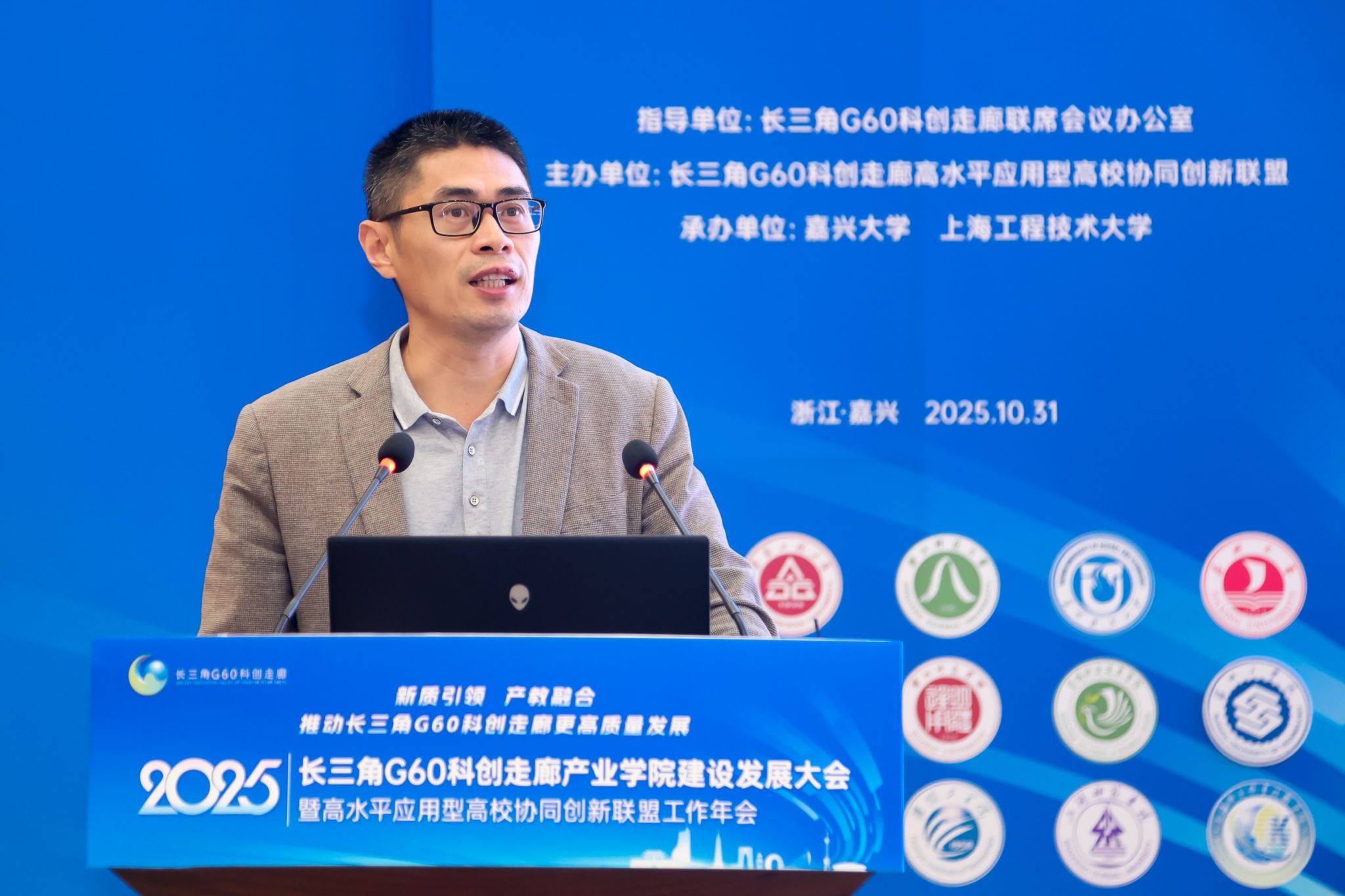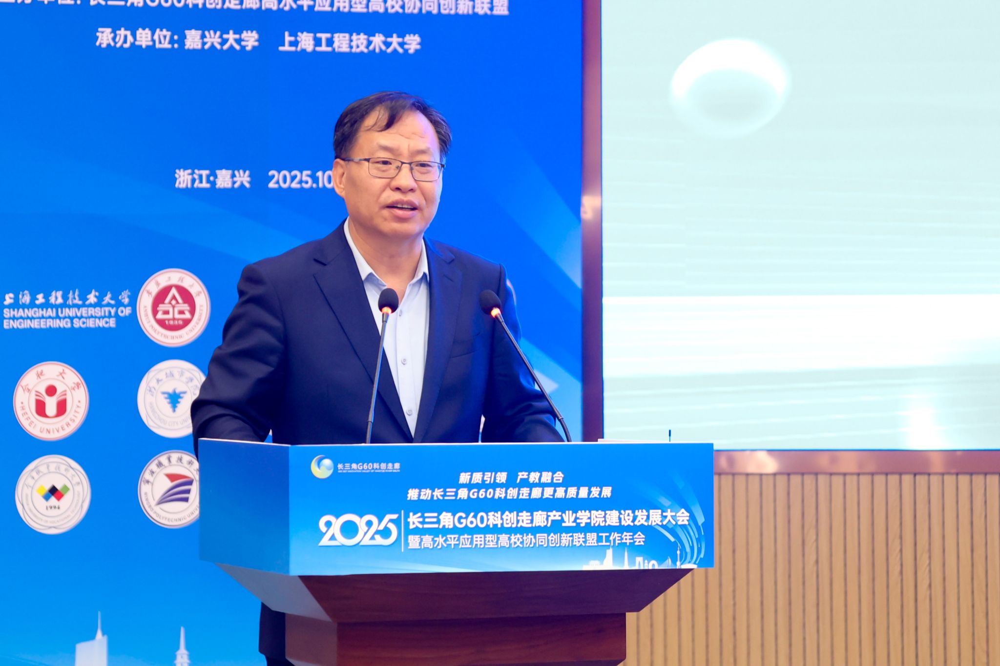 10月31日下午,以“新质引领、产教融合,推动长三角G60科创走廊更高质量发展”为主题的2025年长三角G60科创走廊产业学院建设与发展大会暨高水平应用型高校协同创新联盟年会在嘉兴大学举行。G60联席办主任、松江区委常委、副区长刘福升,嘉兴市政府副秘书长金球,嘉兴大学校长梅德庆,合肥大学校长任永,上海工程技术大学副校长夏春明,宁波职业技术大学校长吴向鹏,宣城职业技术学院副院长蔡冠群,上海科创职业技术学院副校长汪崇德出席。嘉兴大学党委委员、副校长王立玮主持年会。