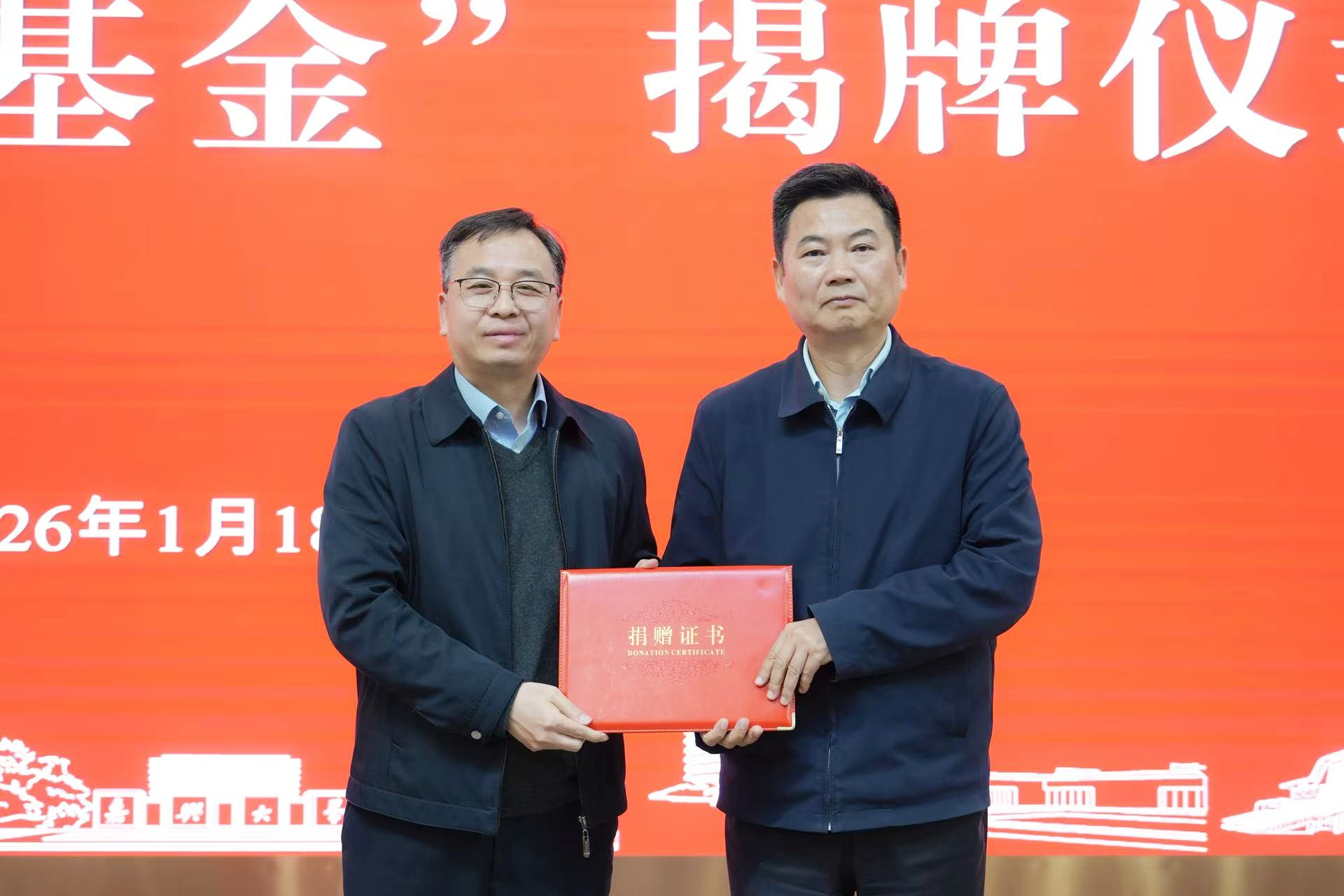 校党委书记沈希与校长梅德庆共同为“方勤教育基金”揭牌。